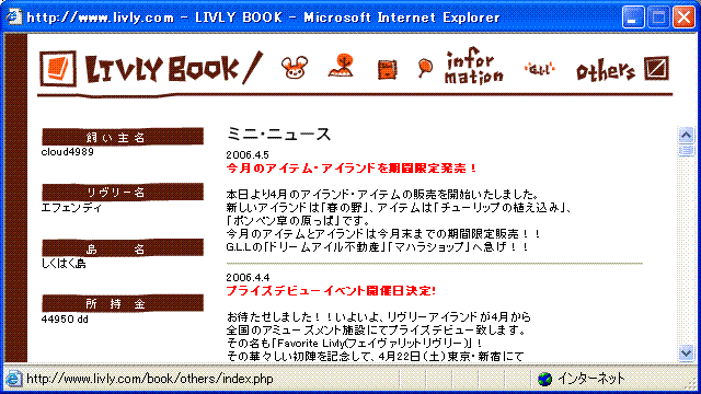 『Livly Island』『リヴリーアイランド』は、ソニーコミュニケーションネットワーク株式会社の商標です。 リヴリーアイランドに関わる著作権その他一切の知的財産権は、ソニーコミュニケーションネットワーク株式会社に属します。 このサイトは『リヴリーアイランド』およびソニーコミュニケーションネットワーク株式会社とは一切関係がありません。
