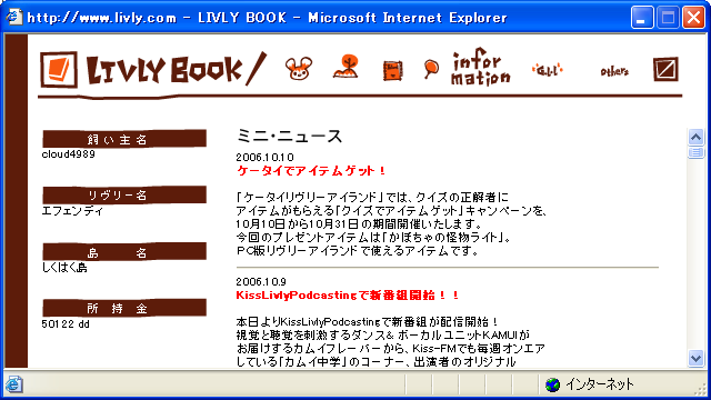 『Livly Island』『リヴリーアイランド』は、ソニーコミュニケーションネットワーク株式会社の商標です。 リヴリーアイランドに関わる著作権その他一切の知的財産権は、ソニーコミュニケーションネットワーク株式会社に属します。 このサイトは『リヴリーアイランド』およびソニーコミュニケーションネットワーク株式会社とは一切関係がありません。